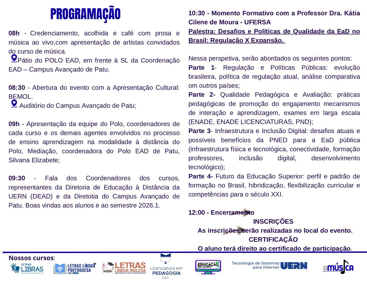 O evento tem como público-alvo os alunos ingressastes e veteranos dos cursos das licenciaturas: Educação do Campo, Letras Língua Portuguesa, Letras Inglês, Letras Libras, Pedagogia e Música, e os tecnólogos: Sistemas para Internet e Segurança Pública, e ocorrerá no dia 07/03/2026, no Campus Avançado de Patu, às 8h00.