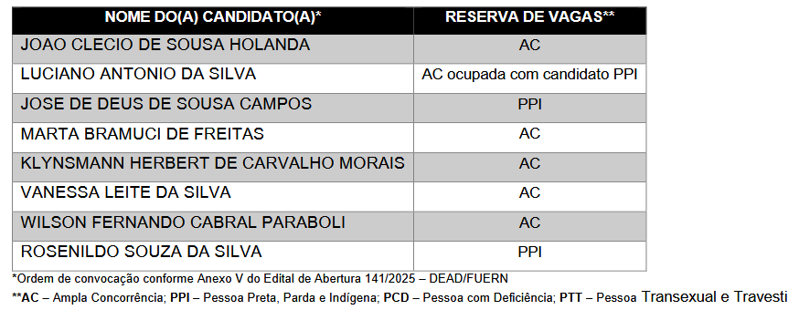Já por meio do Edital Nº 050/2026, faz a convocação dos candidatos aprovados no processo seletivo de tutores(as) a distância regido pelo Edital Nº 141/2025 para atuação no curso de Tecnólogo em Segurança Pública, na modalidade a distância. Confira o nome dos convocados no quadro abaixo: