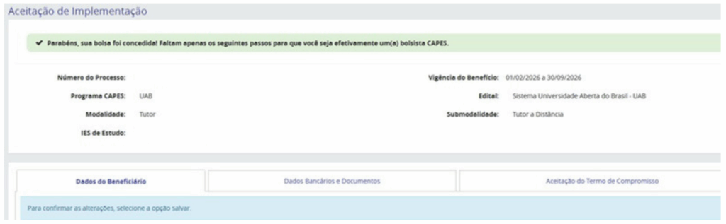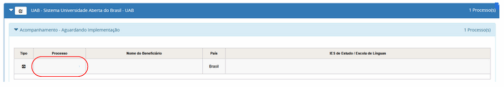 Caso apresenta a frase Acompanhamento: Aguardando Implementação significa que o bolsista não preencheu todos os dados ou não inseriu todos os documentos.