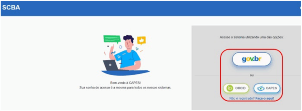 1. O Bolsista deve acessar o SCBA por meio do link: https://scba.capes.gov.br/scba/