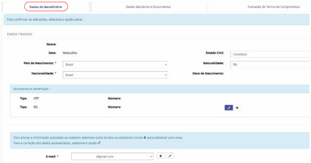 5. Na guia Dados do Beneficiário confirme se seus dados estão corretos e preencha o que estiver faltando.