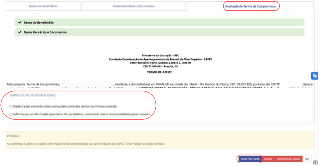 7. Após o preenchimento de todos os dados, na guia Aceitação do Termo de Compromisso, você deve realizar a leitura do termo, marcar as caixas de seleção do termo de responsabilidade ao final da tela e clicar no botão Confirmar Aceite.