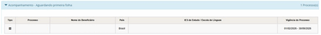 8. Tendo realizado todas as etapas apresentadas, no processo do bolsista deverá mostrar a seguinte mensagem: Acompanhamento – Aguardando primeira folha.